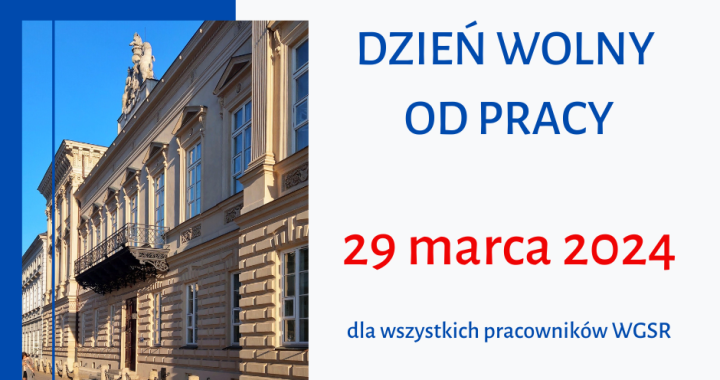 Zgodnie z DECYZJĄ NR 2/2024 Dziekana WGSR UW z dnia 25.03.2024 r. dzień 29 marca 2024 r. jest dniem wolnym od pracy dla wszystkich pracowników Wydziału Geografii i Studiów Regionalnych.